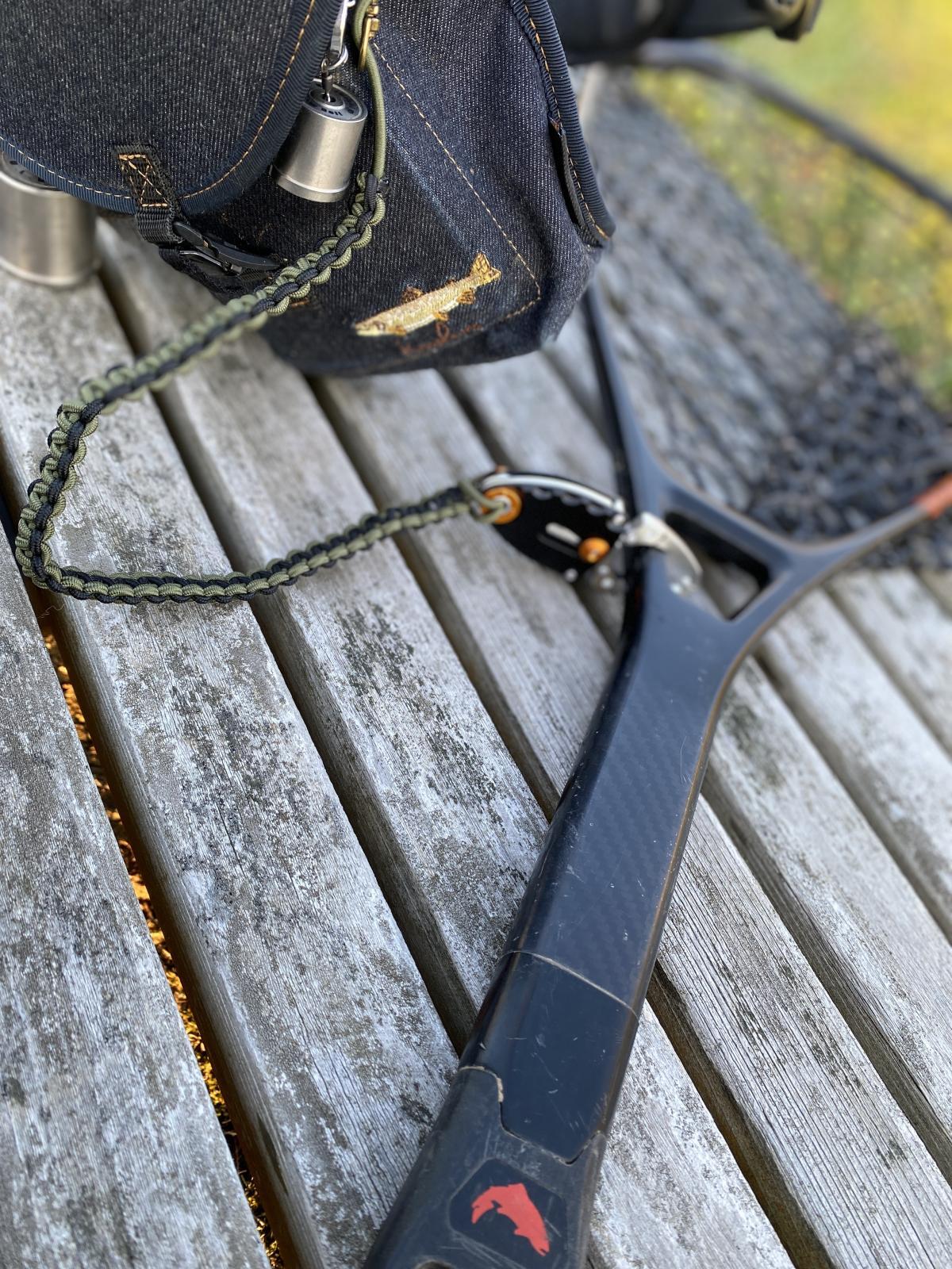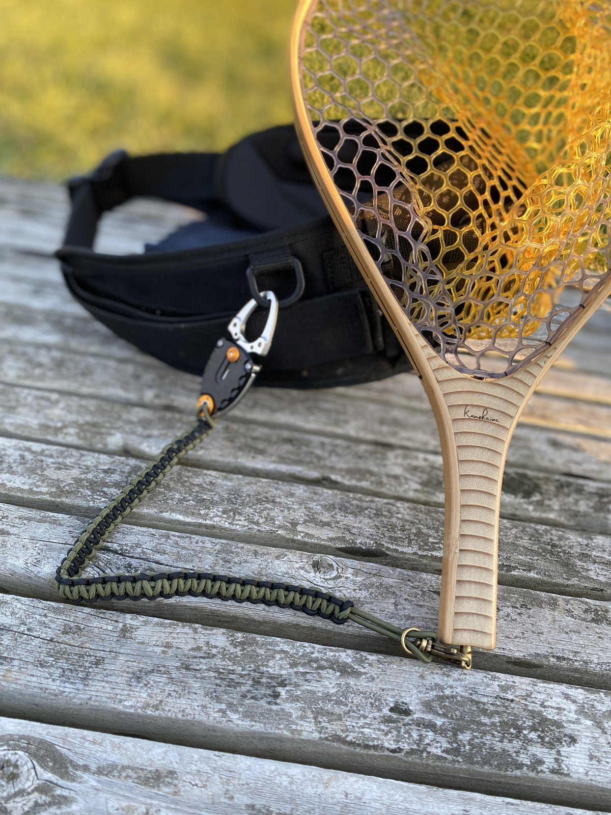 伸び縮みするゴム入りのガイロープ製、手編みのランディングネットコードになります。